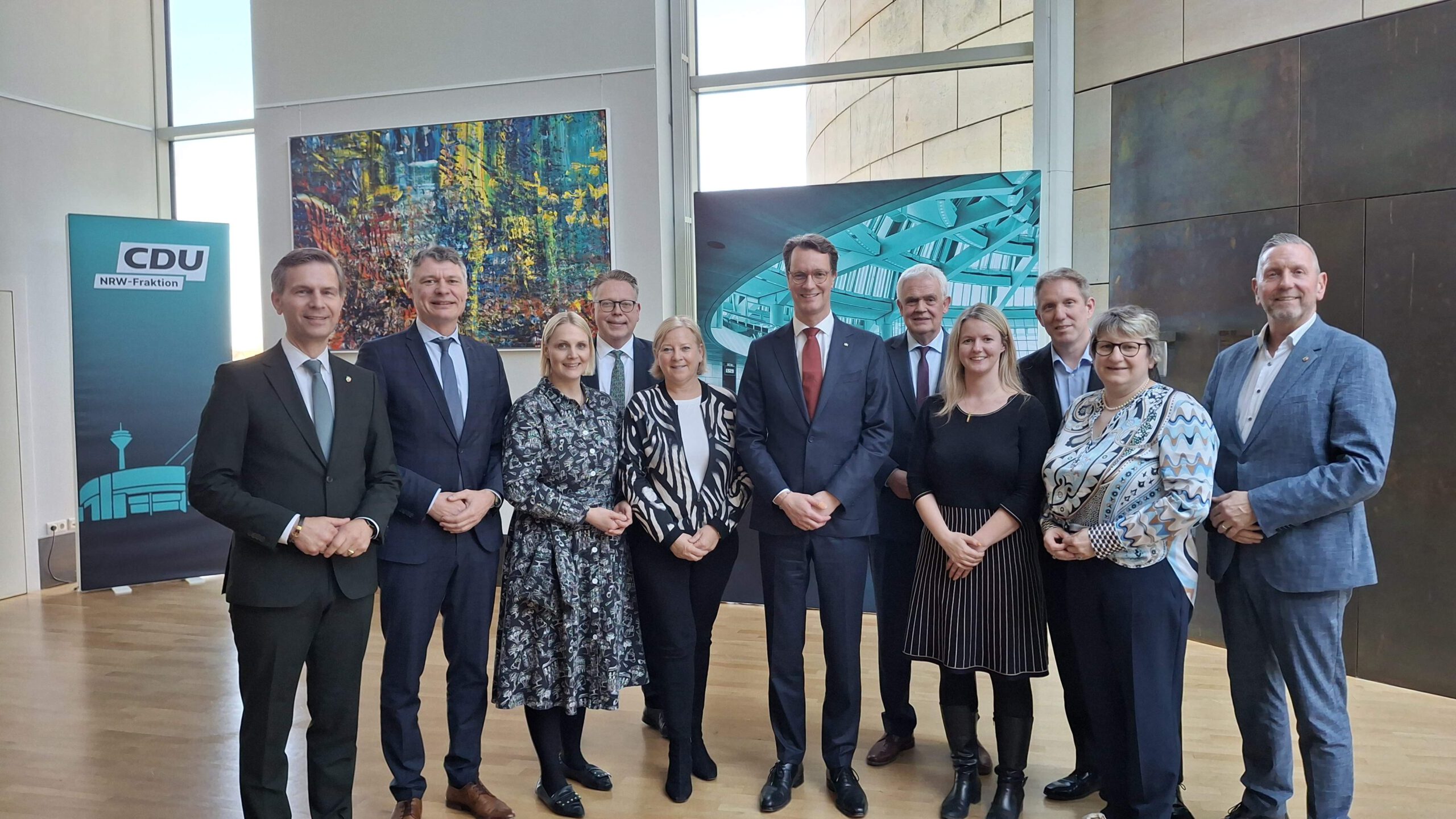 Gruppenfoto der Niederrhein-Abgeordneten der CDU-Fraktion mit NRW-Ministerpräsident Wüst im Düsseldorfer Landtag (v.l.n.r.: Stephan Wolters, Jörg Geerlings, Charlotte Quik, Marc Blondin, Heike Troles, Hendrik Wüst, Günther Bergmann, Vanessa Odermatt, Jochen Klenner, Britta Oellers, Guido Görtz; nicht im Bild Marcus Optendrenk aufgrund einer parallelen Beratung im Plenum)
